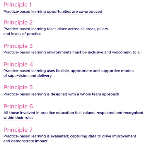 The principles start with you and your practice for learners. There is a helpful terminology explainer to support you to understand the language of practice-based learning and to provide clarity and delineation in what is an often changeable narrative. The principles use the term ‘Practice Educator’. Using this term reinforces to all involved that placements can and do happen across all pillars of practice, not just one as in the case of a clinical educator.