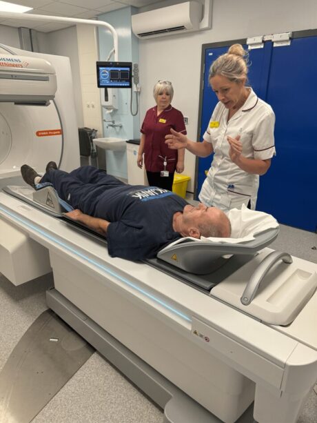 (Image: Viv Orme, Nuclear Medicine Lead, explains the procedure for the scan to patient Simon Burgess.)