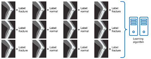 For example, the session explains how an AI might be trained to recognise fractures in X-rays by being provided a dataset of images labelled whether it was a fracture or not – these images are fed into a machine learning algorithm.