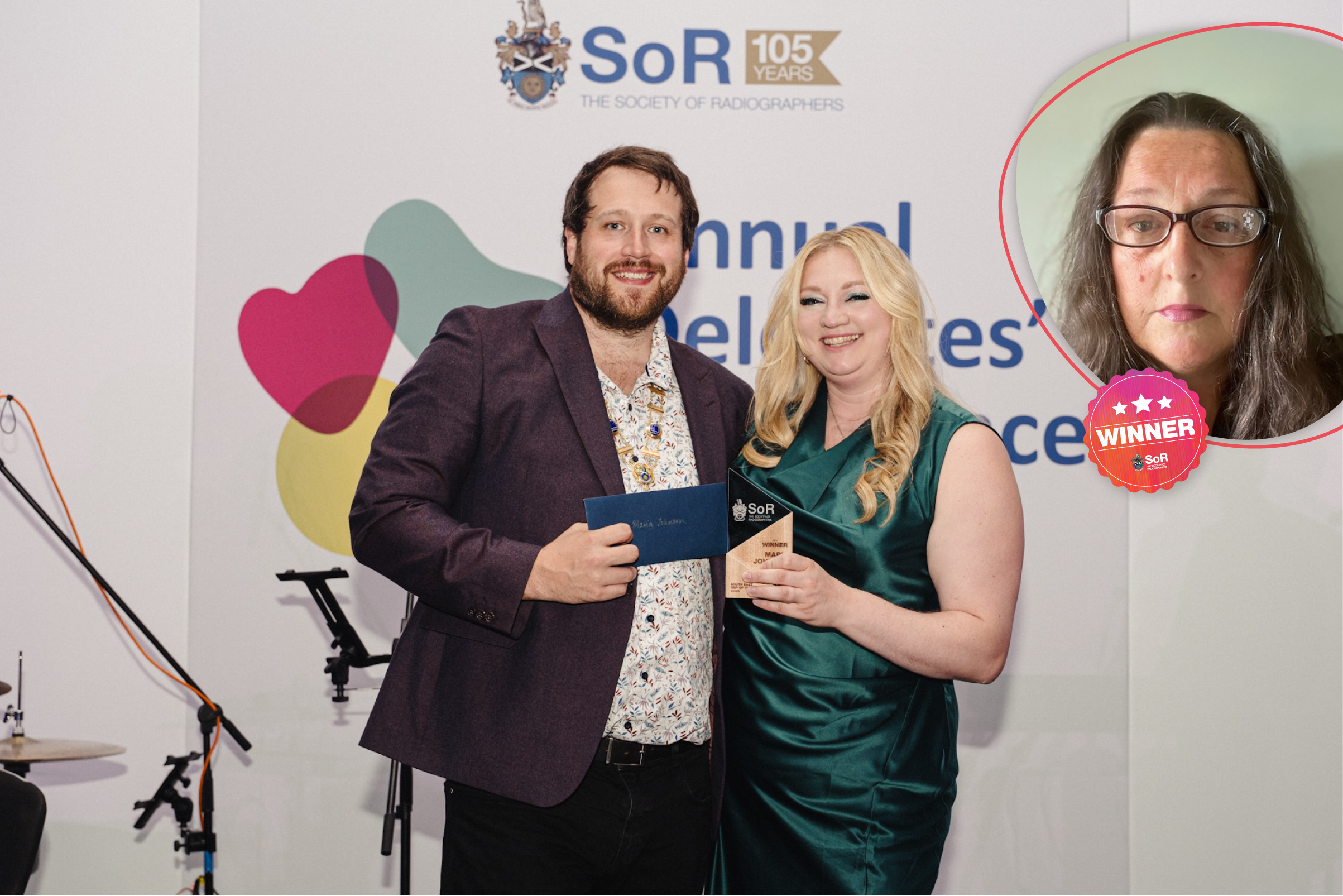 Photo caption: Tom Welton, SoR President and Michaela Clark (Delegate Lead for South East) accepting award on behalf of Maria Johnson.