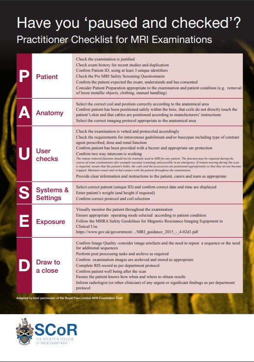 Have you paused and checked? posters and prompt cards have been published to serve as a handy reminder for radiographers carrying out MRI examinations