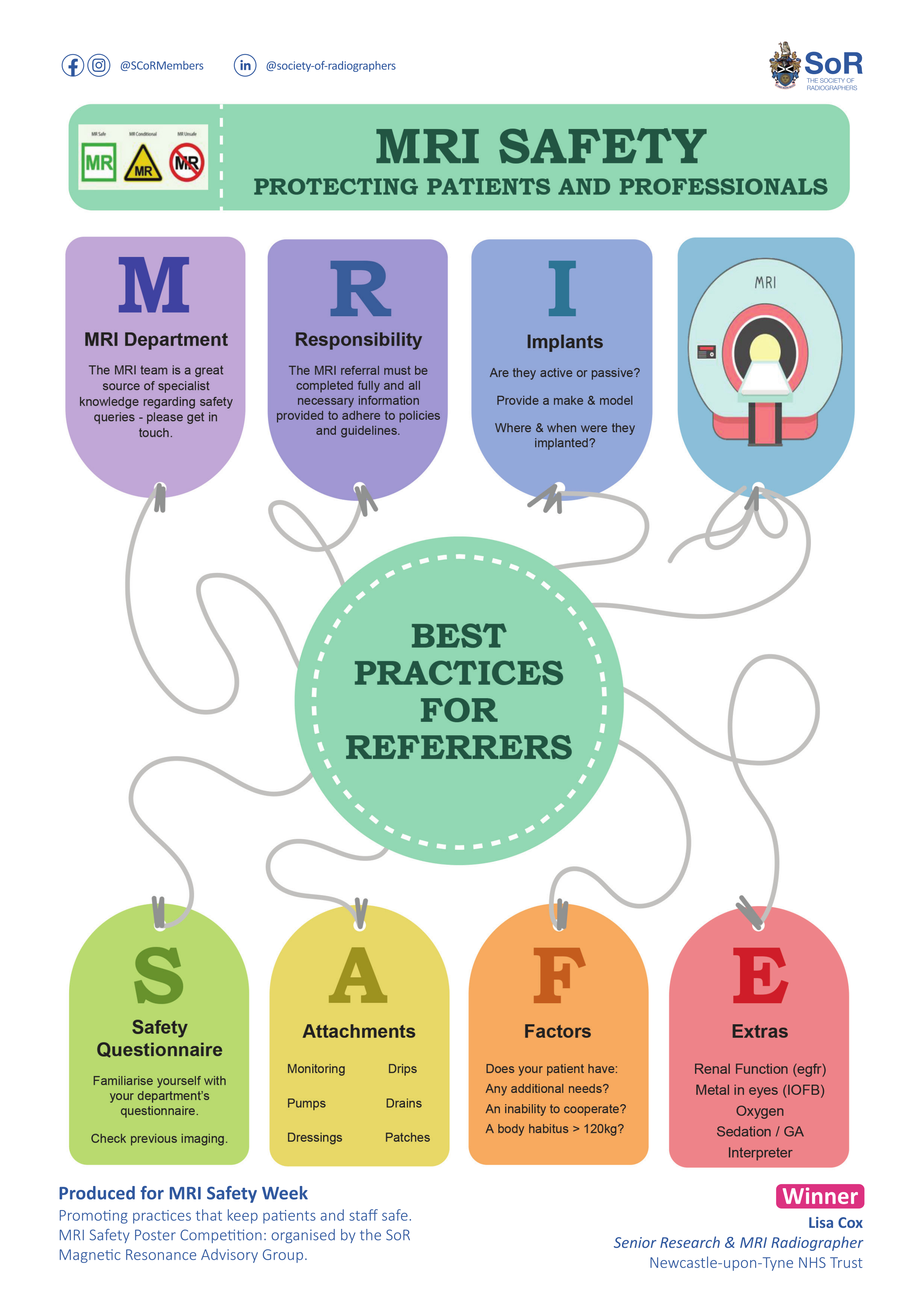 “I'm passionate about MRI safety and wanted my design to provide as much information for referrers as possible, choosing this category also meant I could incorporate considerations such as patient preparation,” Lisa explained. “The two teams I work in are very supportive and knowledgeable, and my colleagues in the research department helped me finalise the content of my design for submission.”