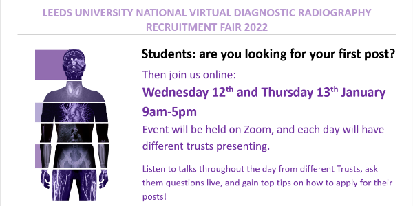 Final year students and newly-qualified practitioners looking for their first post are invited to attend the face-to-face Diagnostic Radiography Recruitment Fair 2023 on Saturday, 14th January 2023 at Leeds University.