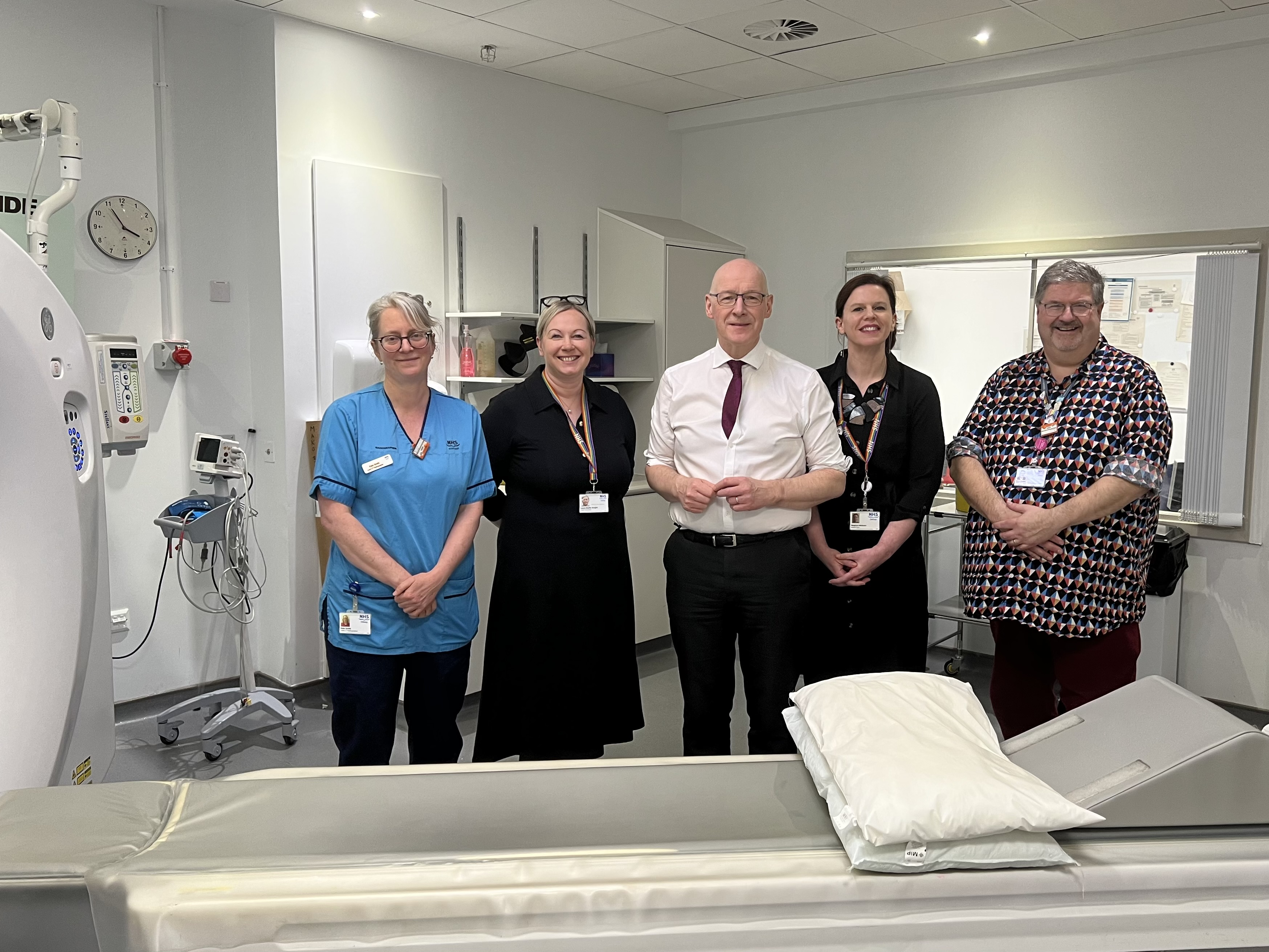 (Image: (Left to right) Kate Smith, CT Lead; Laura Skaife-Knight, Chief Executive; John Swinney, First Minister; Meghan McEwen, Board Chair; Nick Crohn, Radiology Services manager)