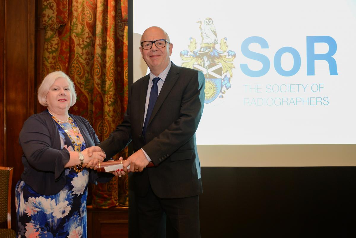 (Image: Steve Milner receiving a Fellowship for the College of Radiographers from 2018/19 SoR president Sue Webb)