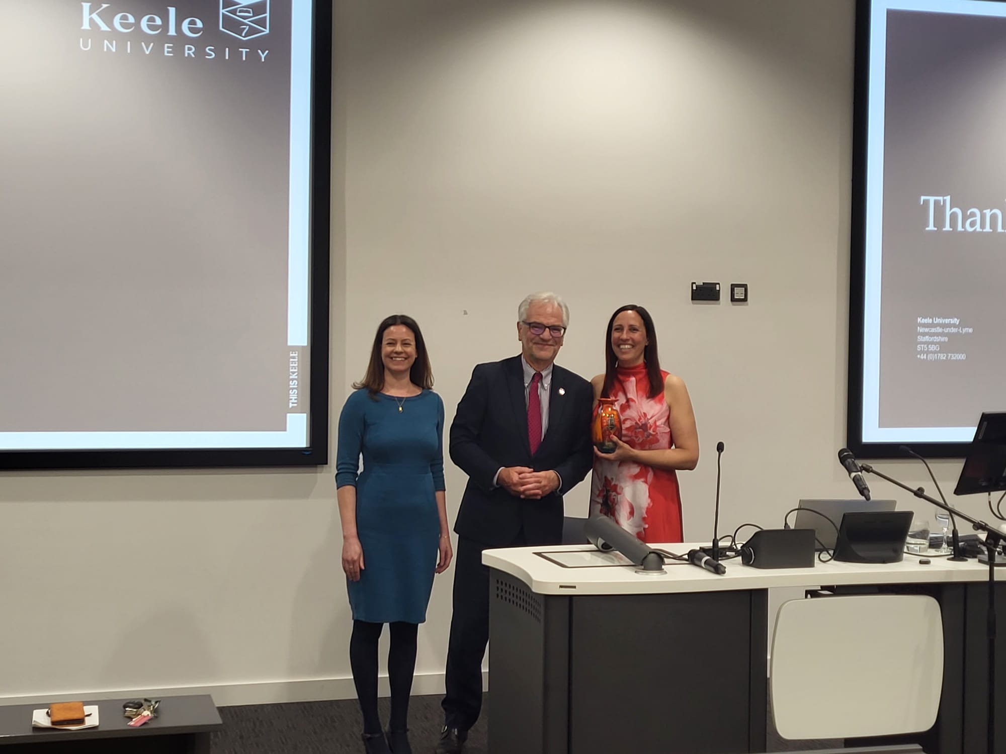 (Image: Professor Heidi Fuller and Professor Trevor McMillan OBE present Professor Shiner with a locally made vase from Stoke-on-Trent given only to the appointed professors)