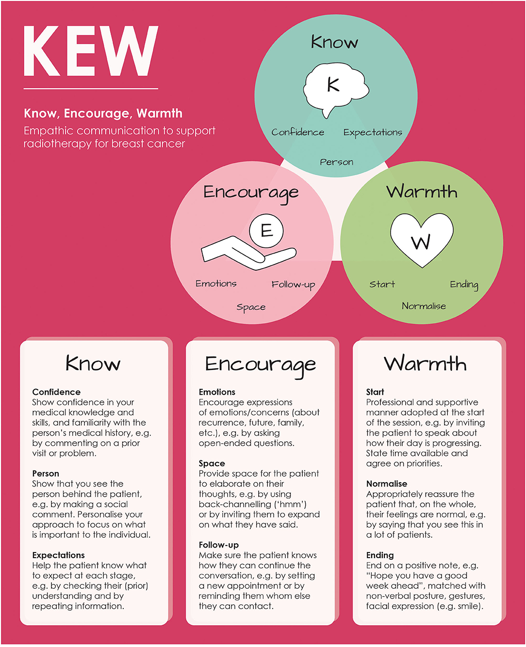 The studies’ findings were collated and turned into the “KEW” communication guidelines for radiographers: Know (Confidence; Expectations; Person), Encourage (Emotions; Space; Follow-up), Warmth (Start; Normalise; Ending).