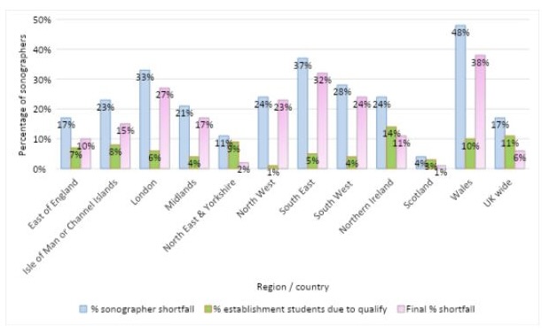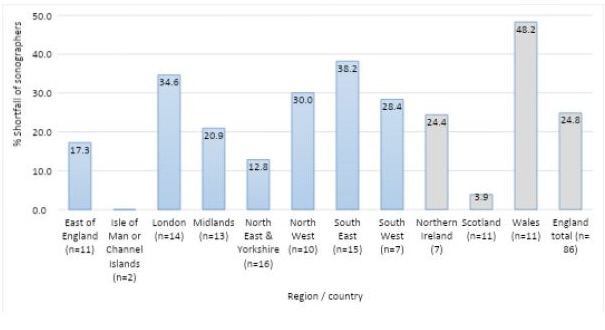 Figure 2: Percentage shortfall of sonographers (WTE) by region and country (NHS only)